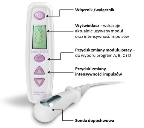 SENSA TONE to elektroniczny Stymulatorem Mięśni Przepony Miednicznej (SMPM) zwanych również potocznie Mięśniami Kegla. SMPM jest metodą polegającą na emisji łagodnych impulsów elektrycznych za pomocą dopochwowej sondy, które powodują skurcze i rozluźnianie się mięśni przepony miednicznej. Urządzenie jest proste w obsłudze i zarazem niezwykle skuteczne. w leczeniu nietrzymania moczu u kobiet w każdym wieku.